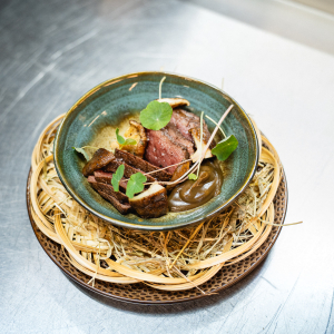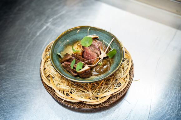 We use a lot of natural decorations to present our dishes. It's not just about the plate, but about what nature itself has to offer. We use various leaves, hazelnuts and walnuts, berries, branches, and even beef bones and fish heads.