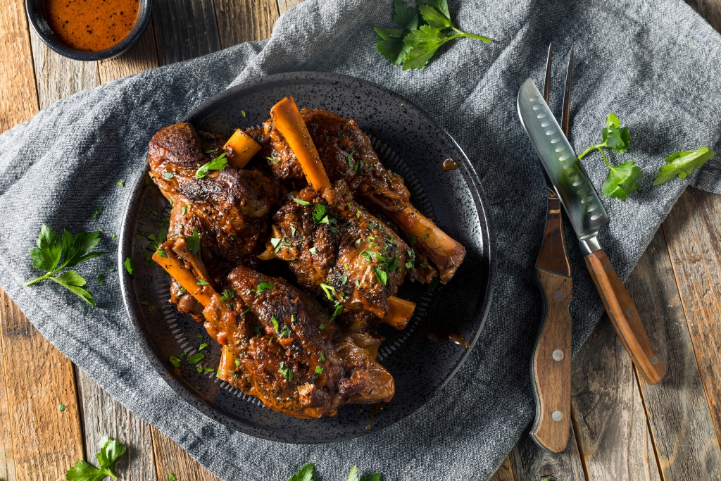 Braised lamb shanks with Jerusalem artichoke and potato mash