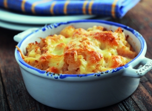 4. Reserve the milk to make a mustard sauce by placing the butter and flour in a suacepan, stirring over low heat until the two ingredients have completely amalgamated. Add salt and the mustard powder and continue stirring. Add milk (preferably while still warm), turn up the heat and whisk until nice, thick and smooth. Lower the heat and add the cheese until it has melted.