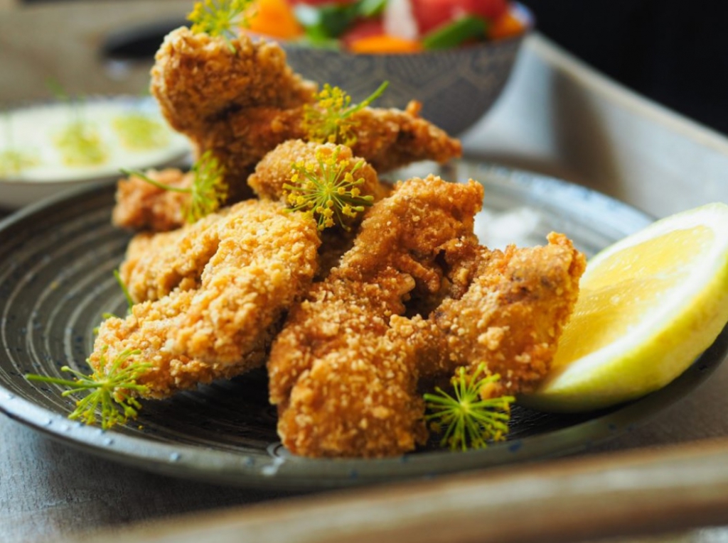 CRISPY CARP FRIES WITH POTATO SALAD AND HORSERADISH SOUR CREAM DIP