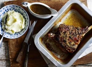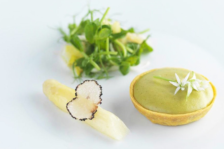 Features spring ingredients: wild garlic, pea sprouts, lamb, rhubarb.