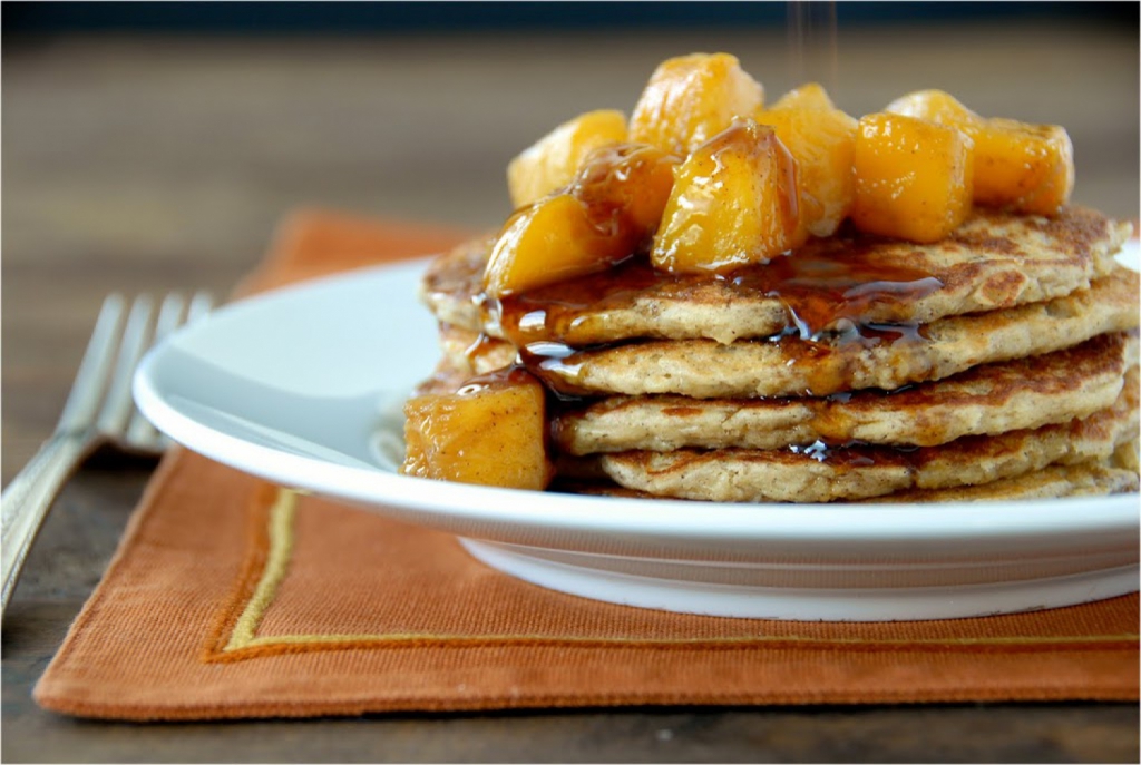 Place the pancake on the plate, put the compote over garnish with a quenelle of sauer cream and few drops of maple syrup.