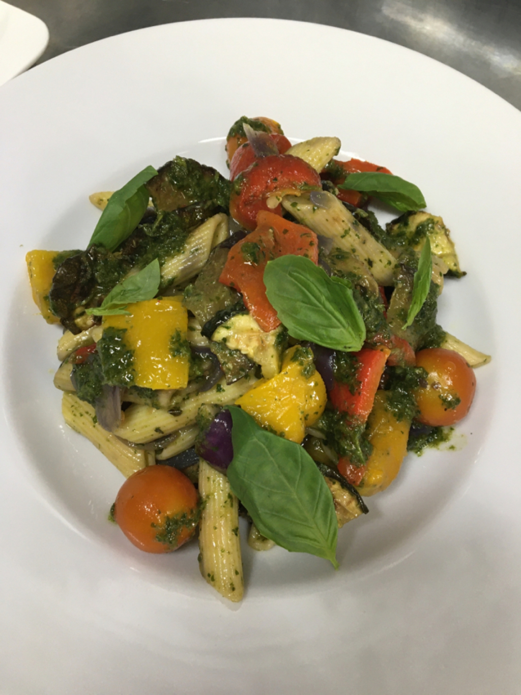 Mix the vegetables, cut in smaller pieces, with the herb oil, add the red onion, combine with pasta and decorate with slow cooked cherry tomatoes and basil leaves into the serving bowl.