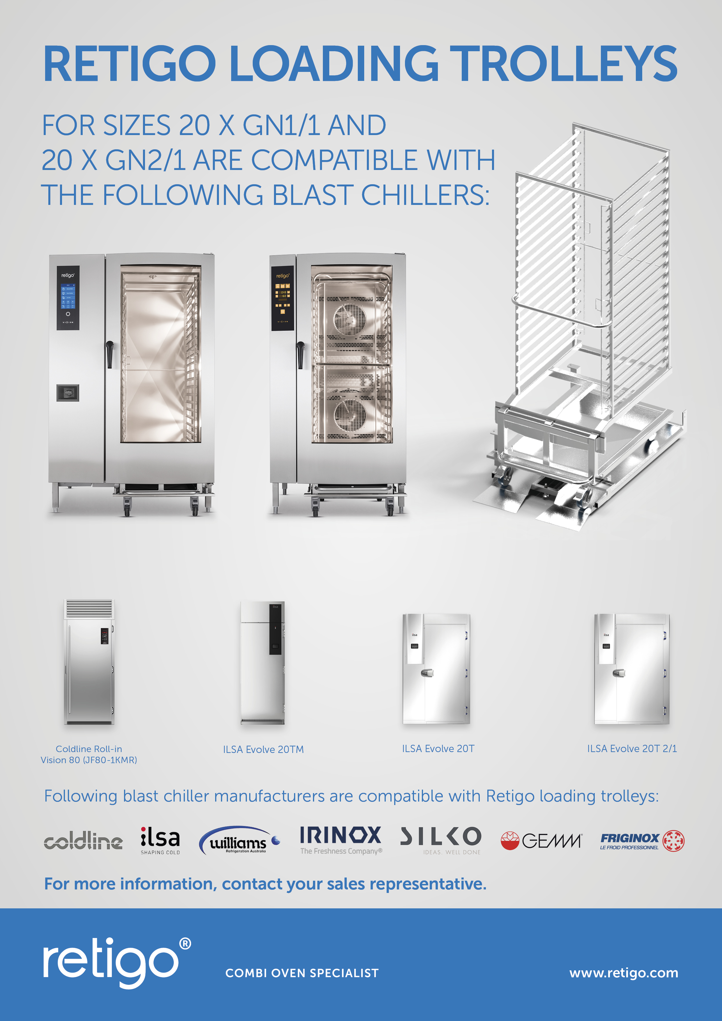 Retigo loading trolleys, sizes 20 x GN 1/1 and 20 x GN 2/1 are compatible with ILSA, Coldline blast chillers and many others.