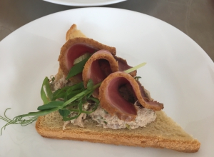 Now you can put it on toast and garnish with the smoked duck breast and chopped spring onion.