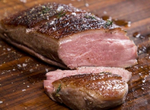 2. Season the duck breasts with salt, thyme and pepper and vacuum pack under full pressure.
