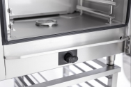 The retractable shower is placed under the cooking chamber behind the door (611, 1011) or under control panel (2011, 1221, 2021).