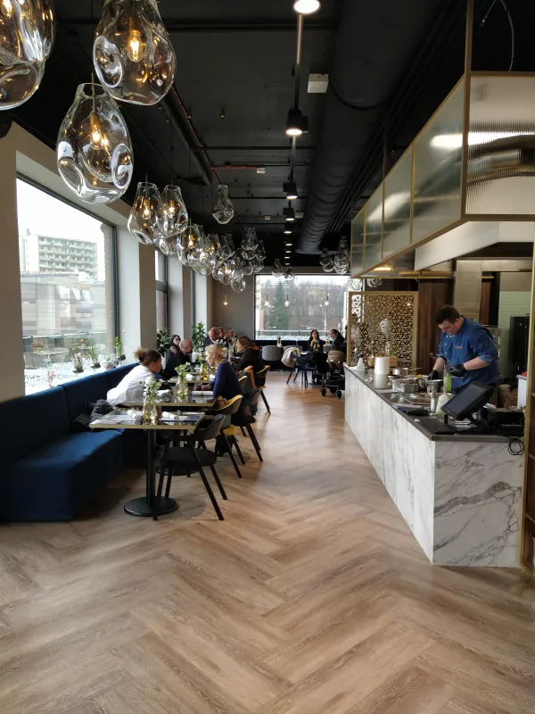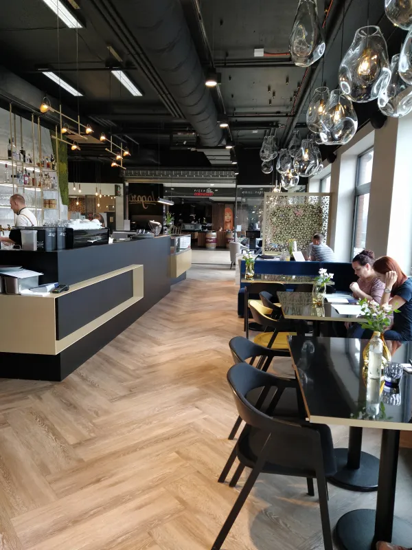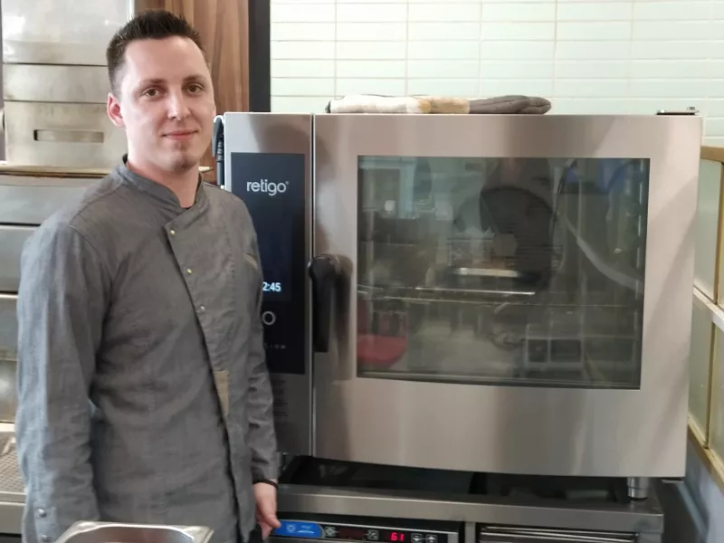 The open kitchen is part of the experience - chefs prepare dishes from the grill right in front of guests' eyes, and modern technology plays a key role in the operation. The bistro is equipped with a Retigo Blue Vision 611 combi oven, which ensures precise and gentle food preparation, as well as a holdomat in the rack, which keeps the finished dishes at serving temperature without loss of quality.